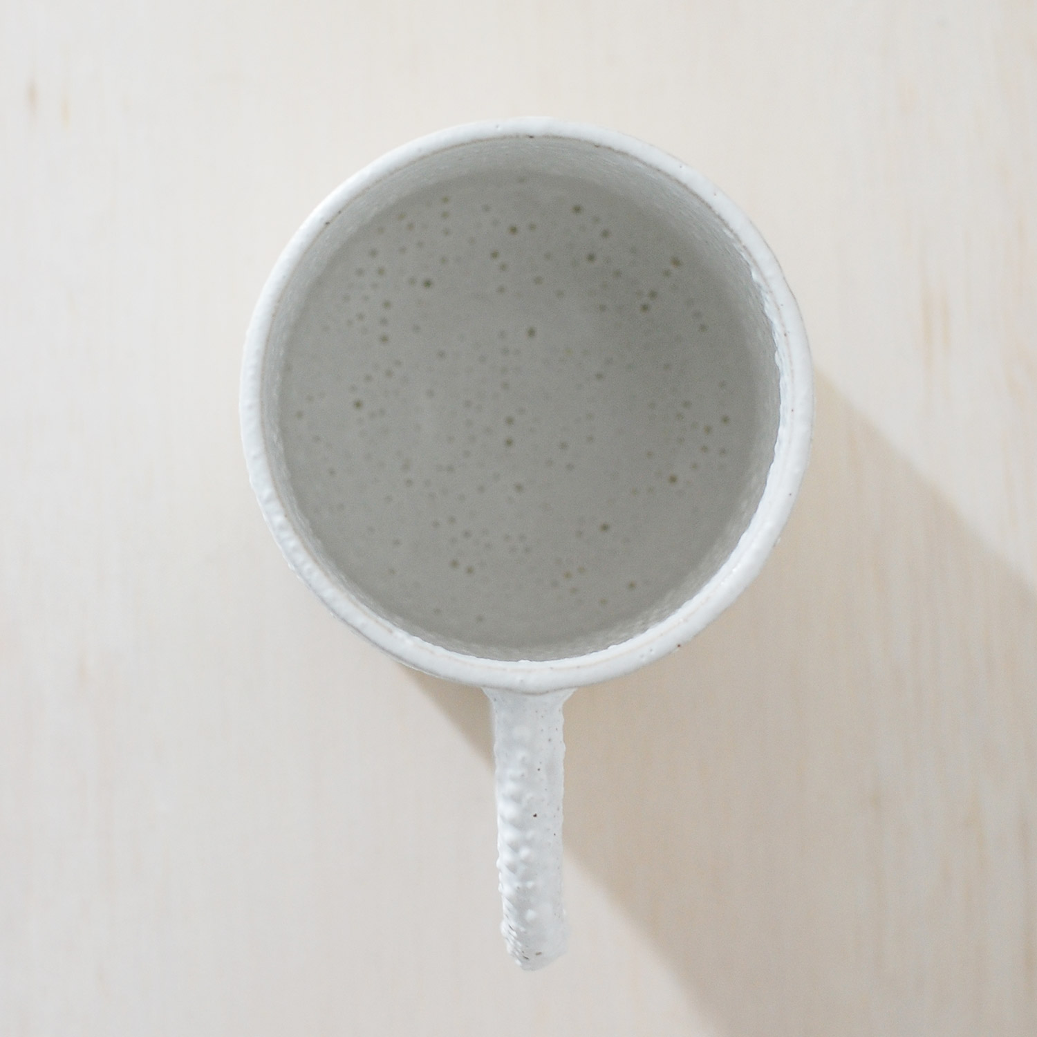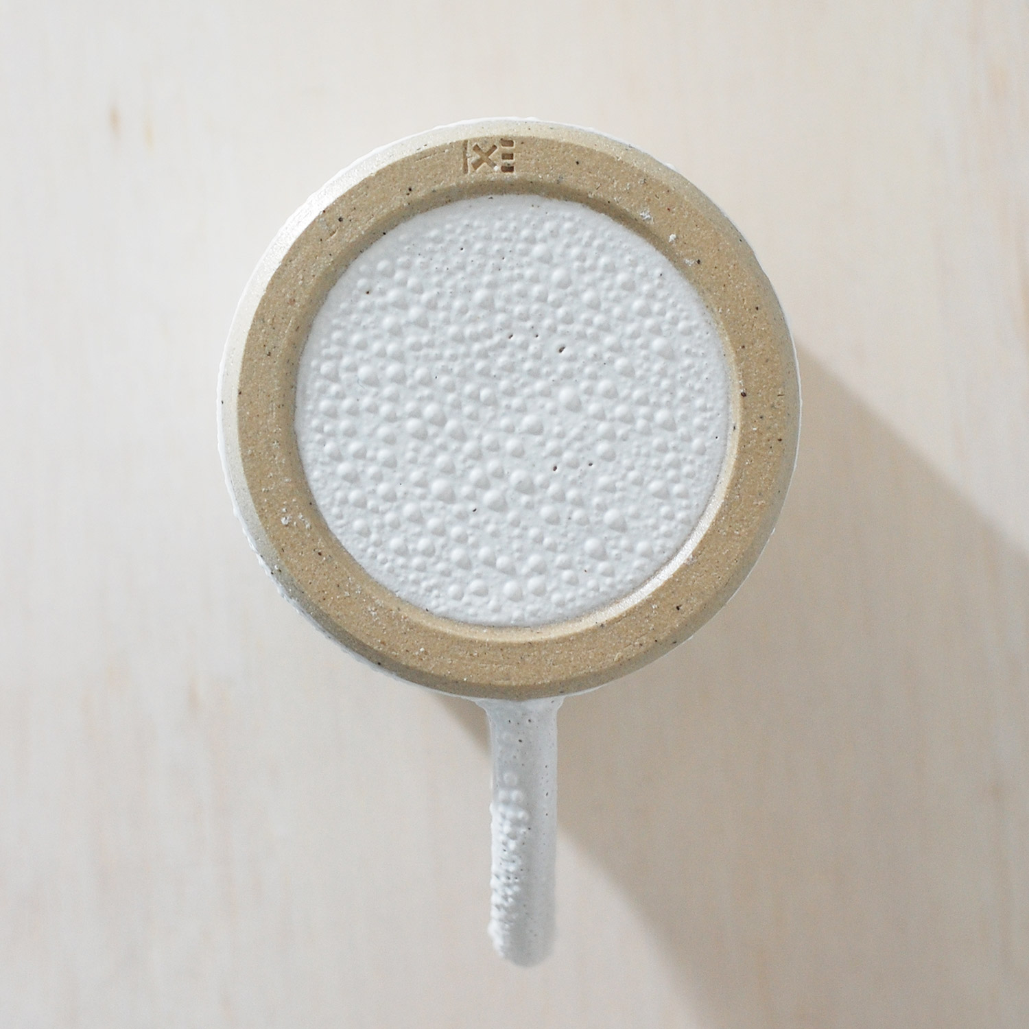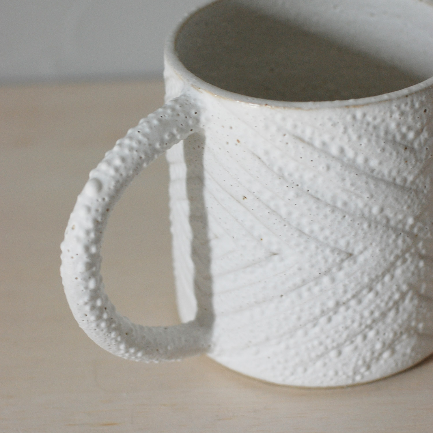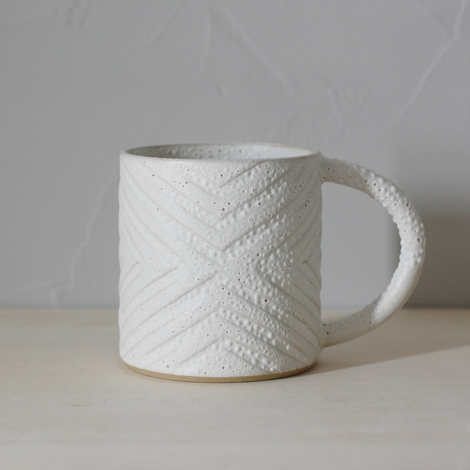 オリジナル配合のサンドベージュ色の陶土をろくろ成型し、手で模様を彫っています。