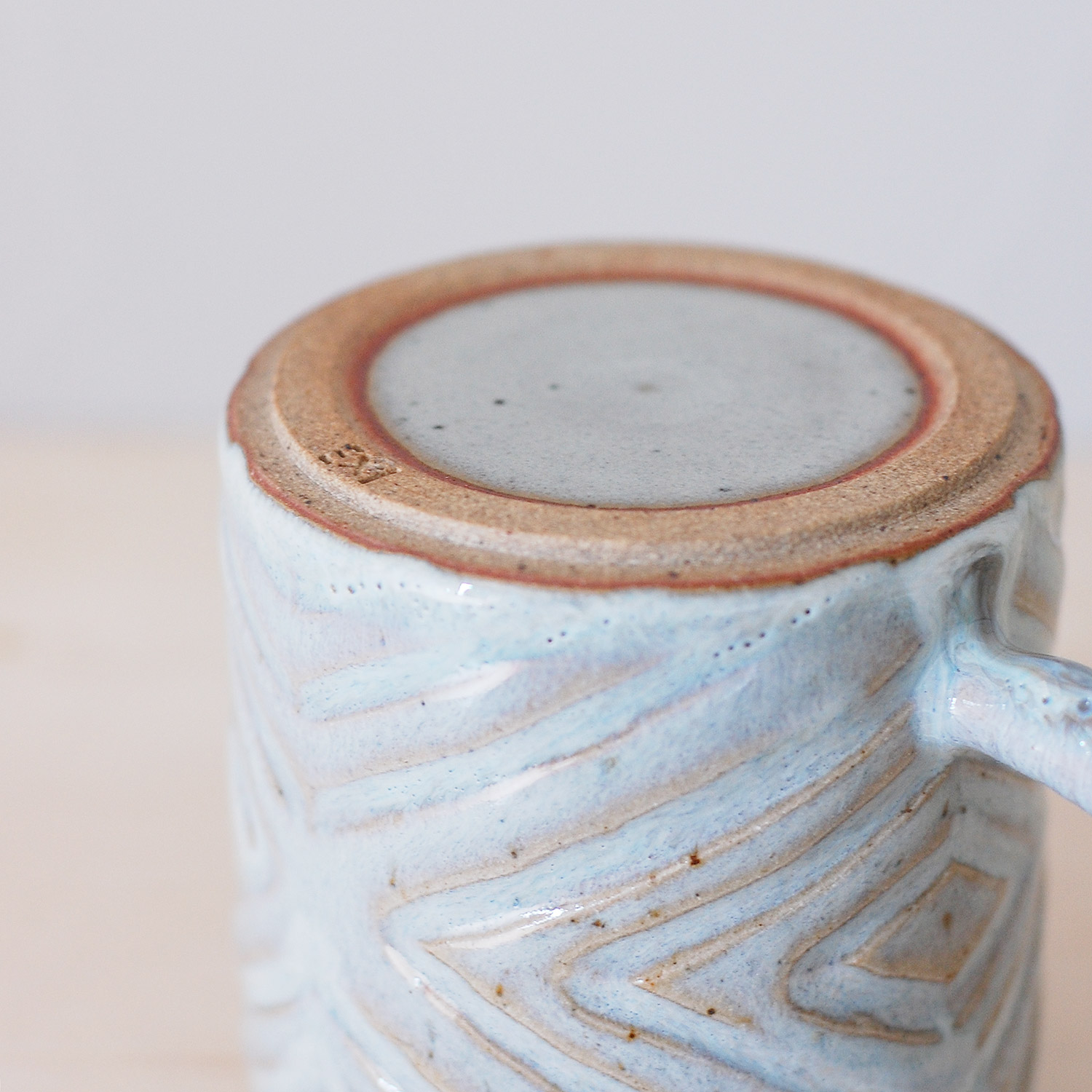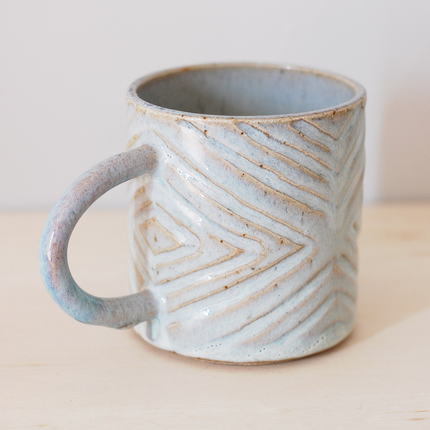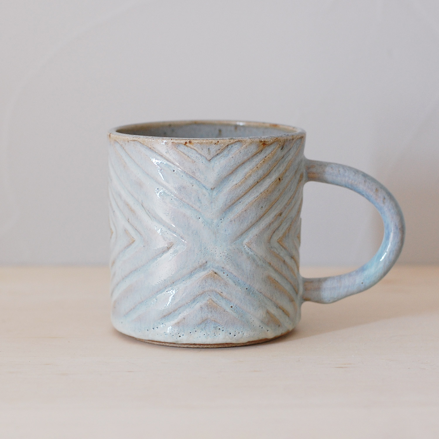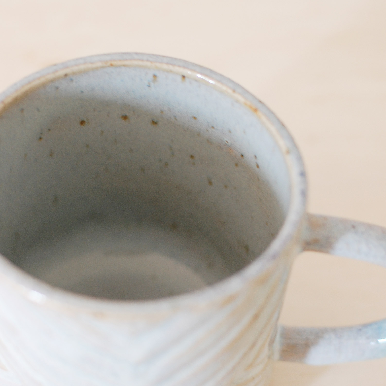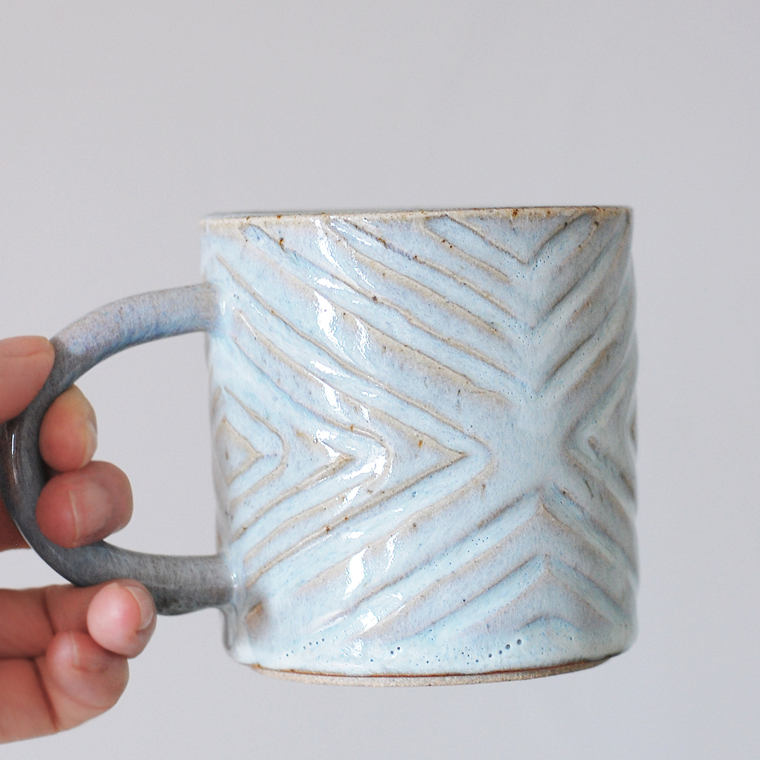 温かみのあるサンドベージュ色の陶土をろくろ成型し、手で模様を彫っています。