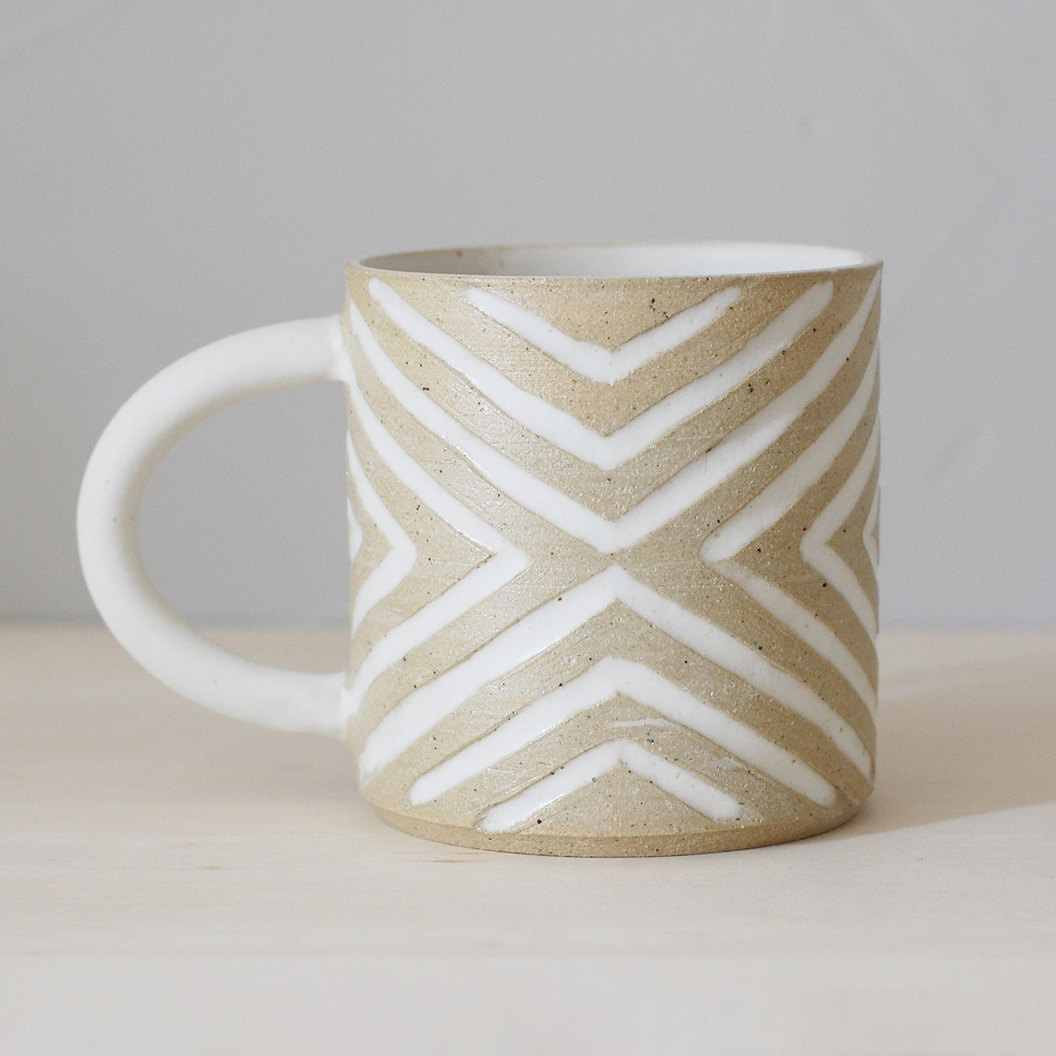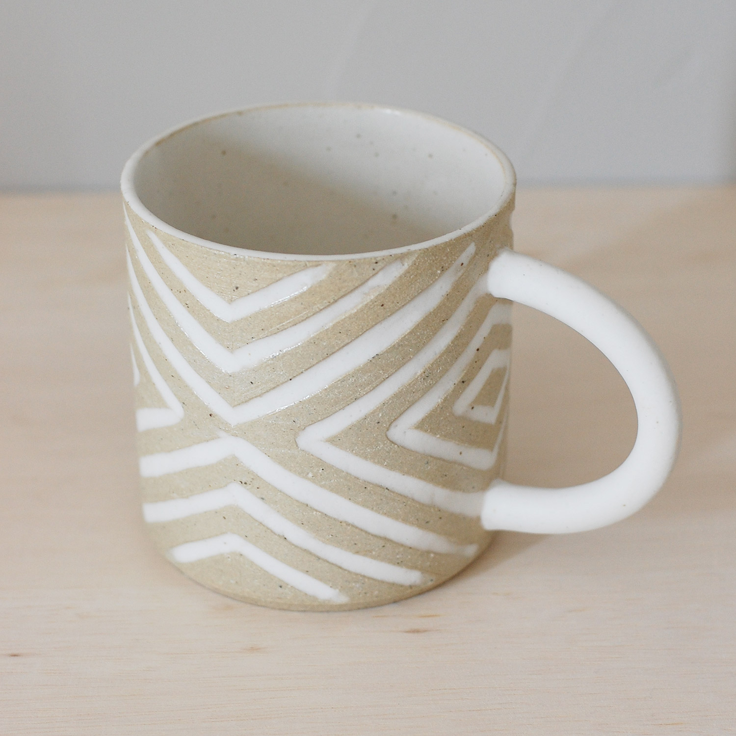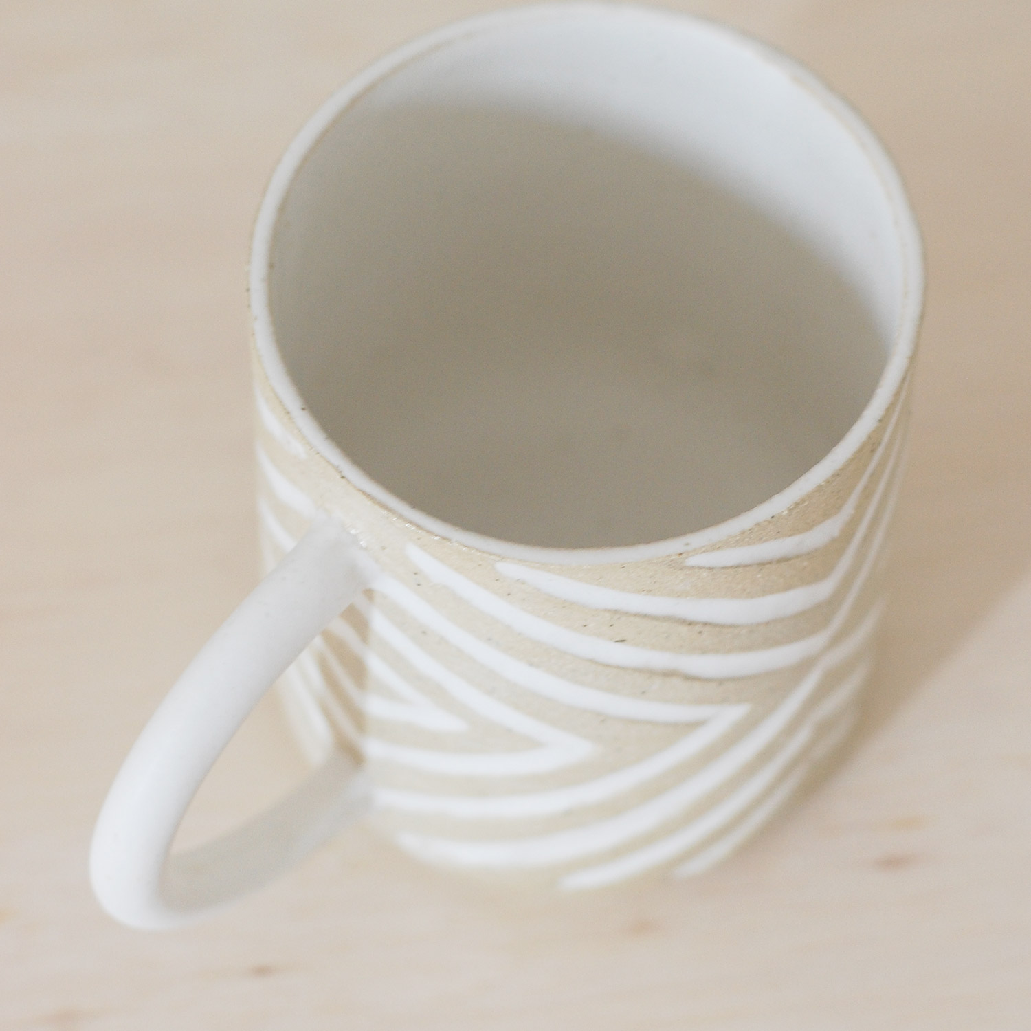 温かみのあるサンドベージュ色の陶土をろくろ成型し、手で模様を彫っています。