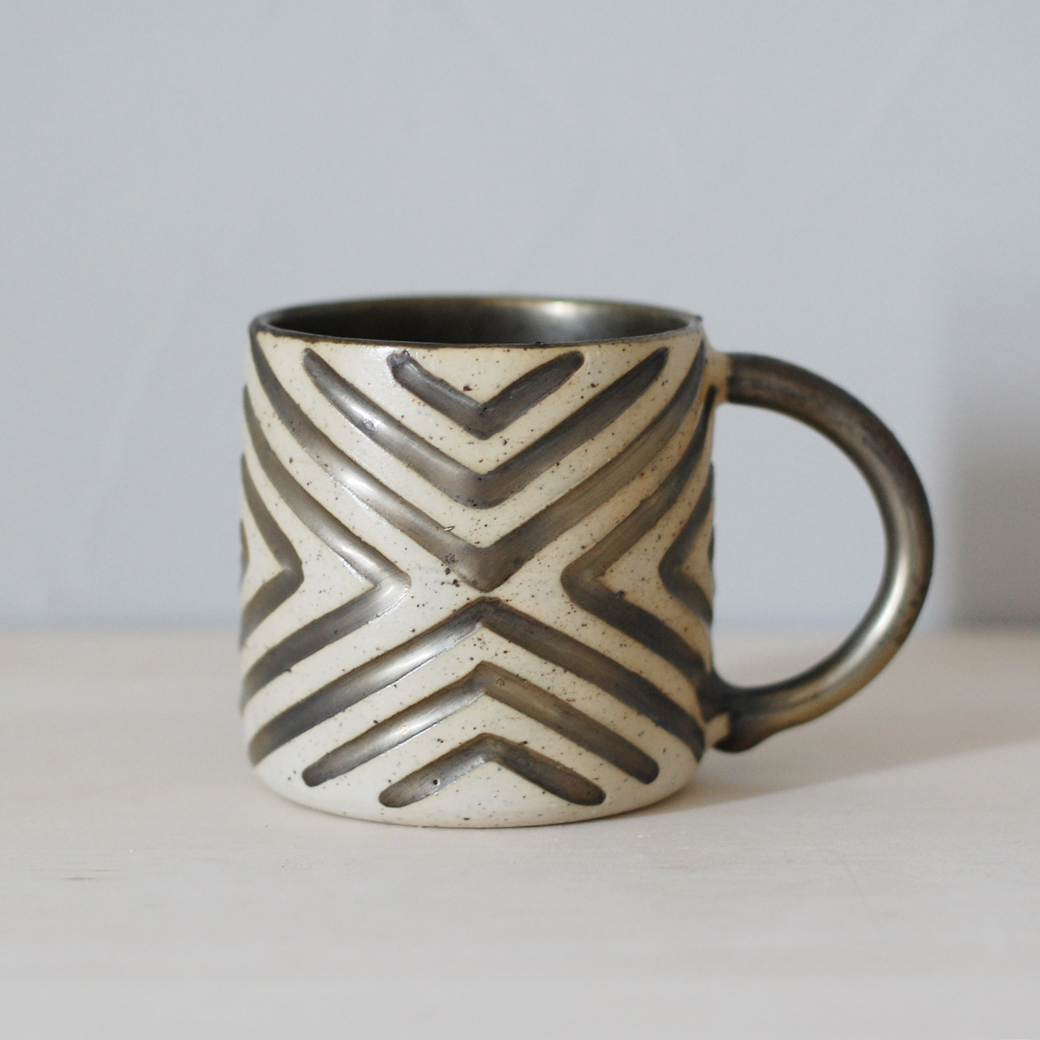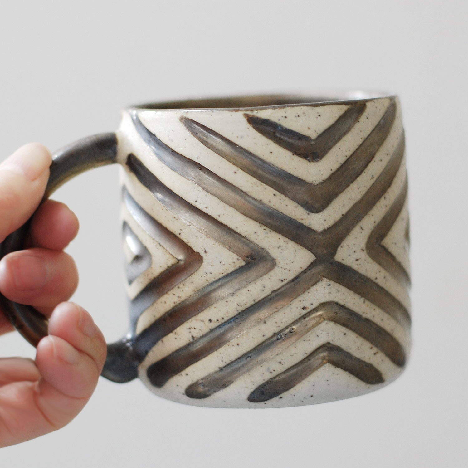 オリジナルブレンドの土をろくろ成型し、手で模様を彫っています。