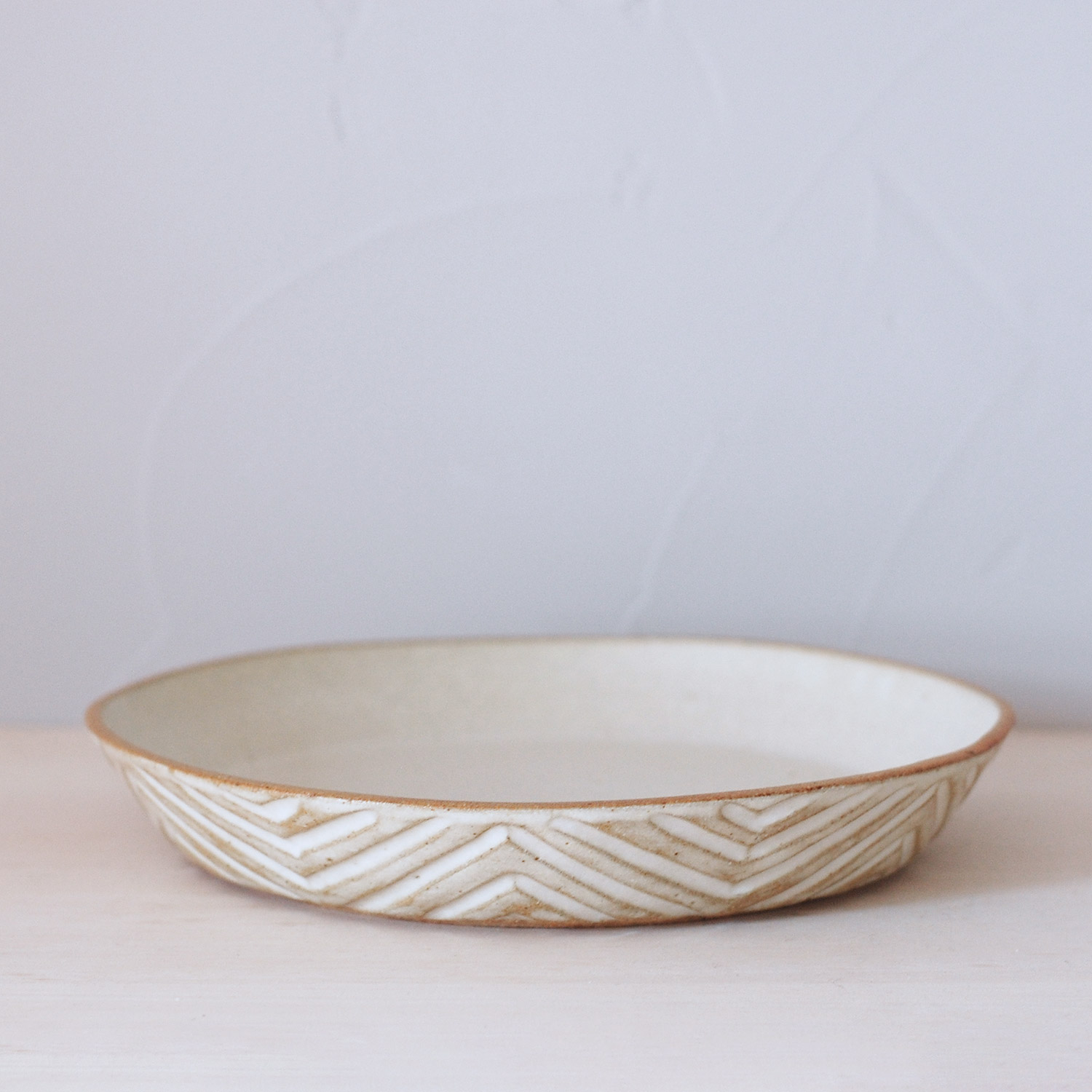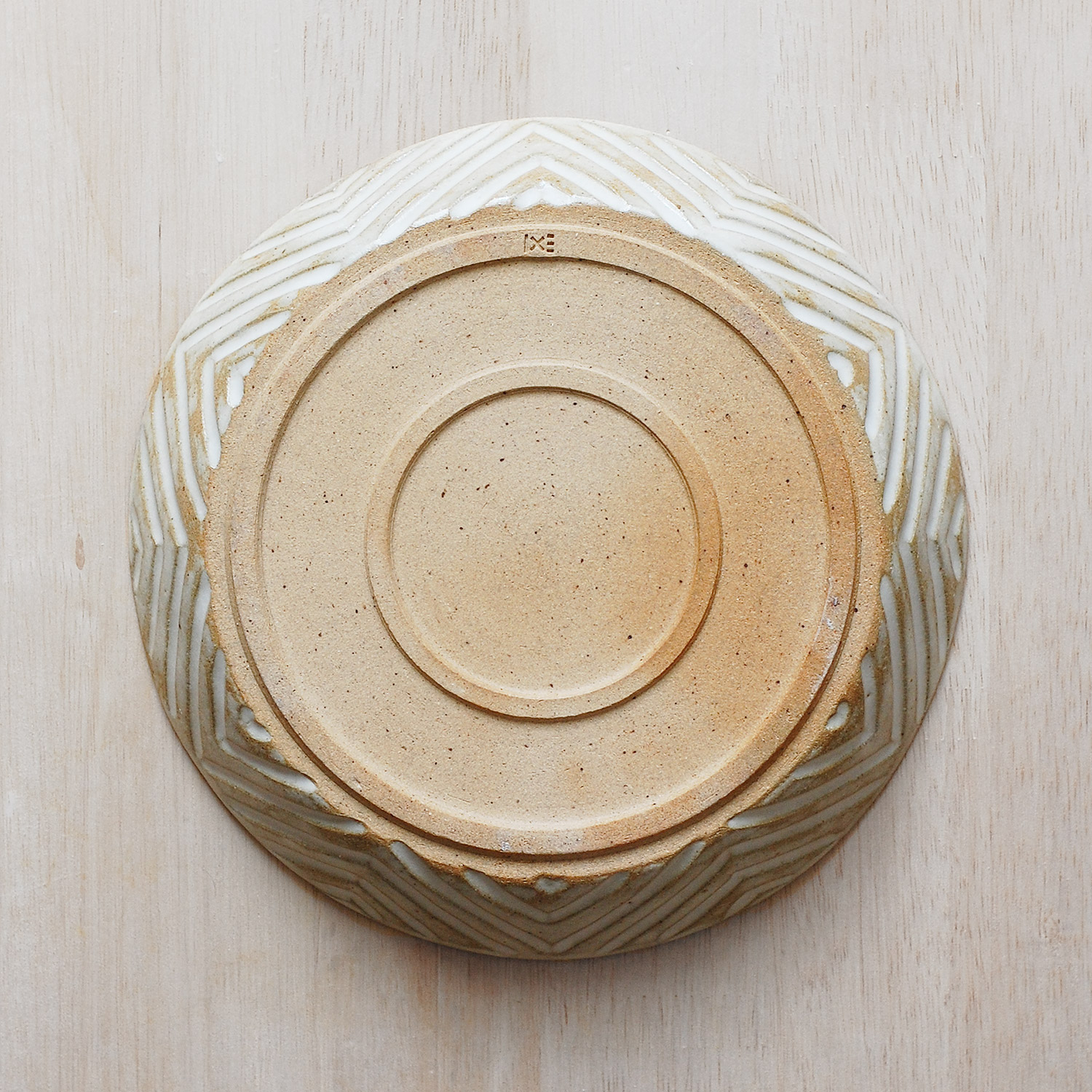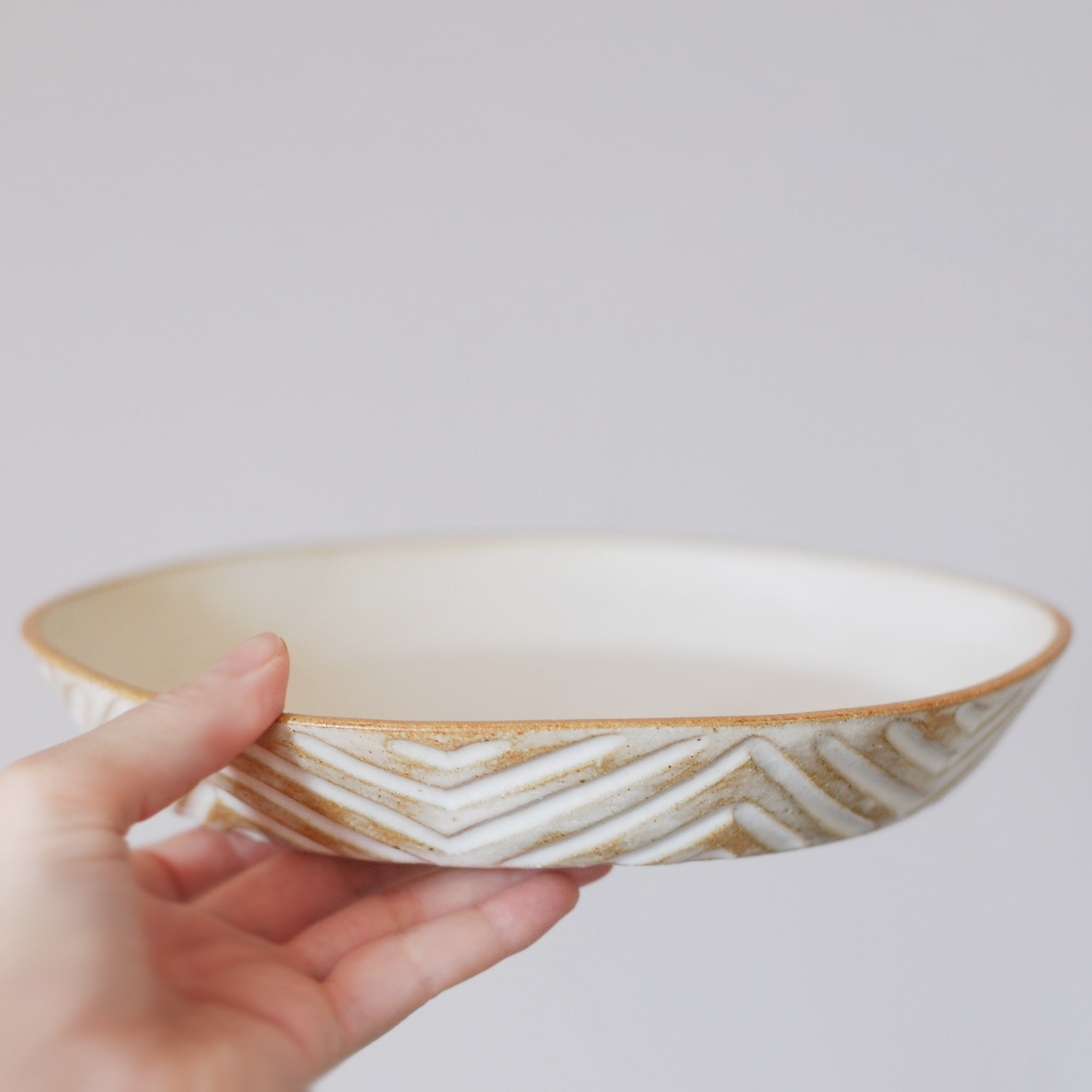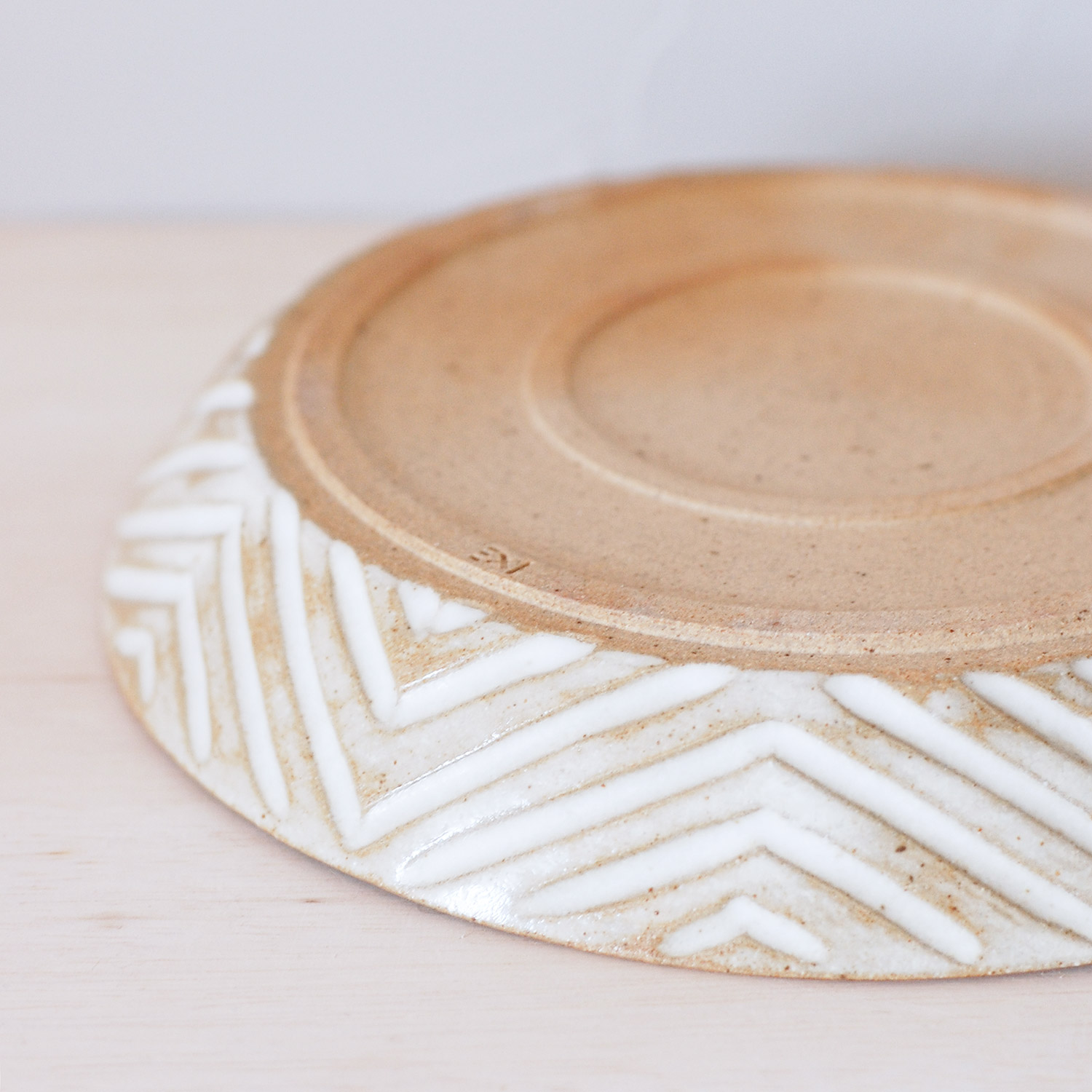 温かみのあるサンドベージュ色の陶土をろくろ成型し、手で模様を彫っています。