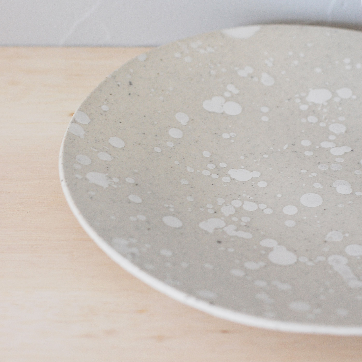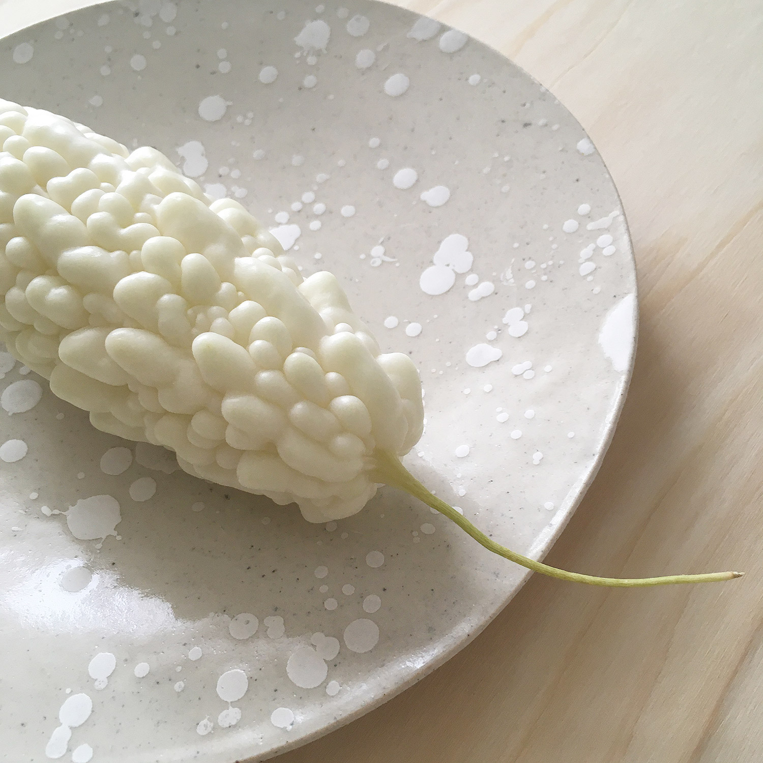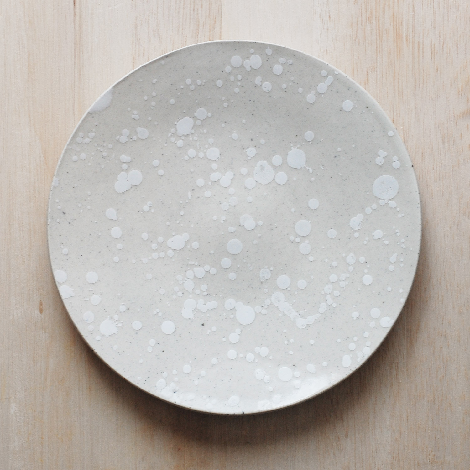 炻器色を活かす透明釉に、質感の異なる白を散りばめ遊び心をプラスしています。