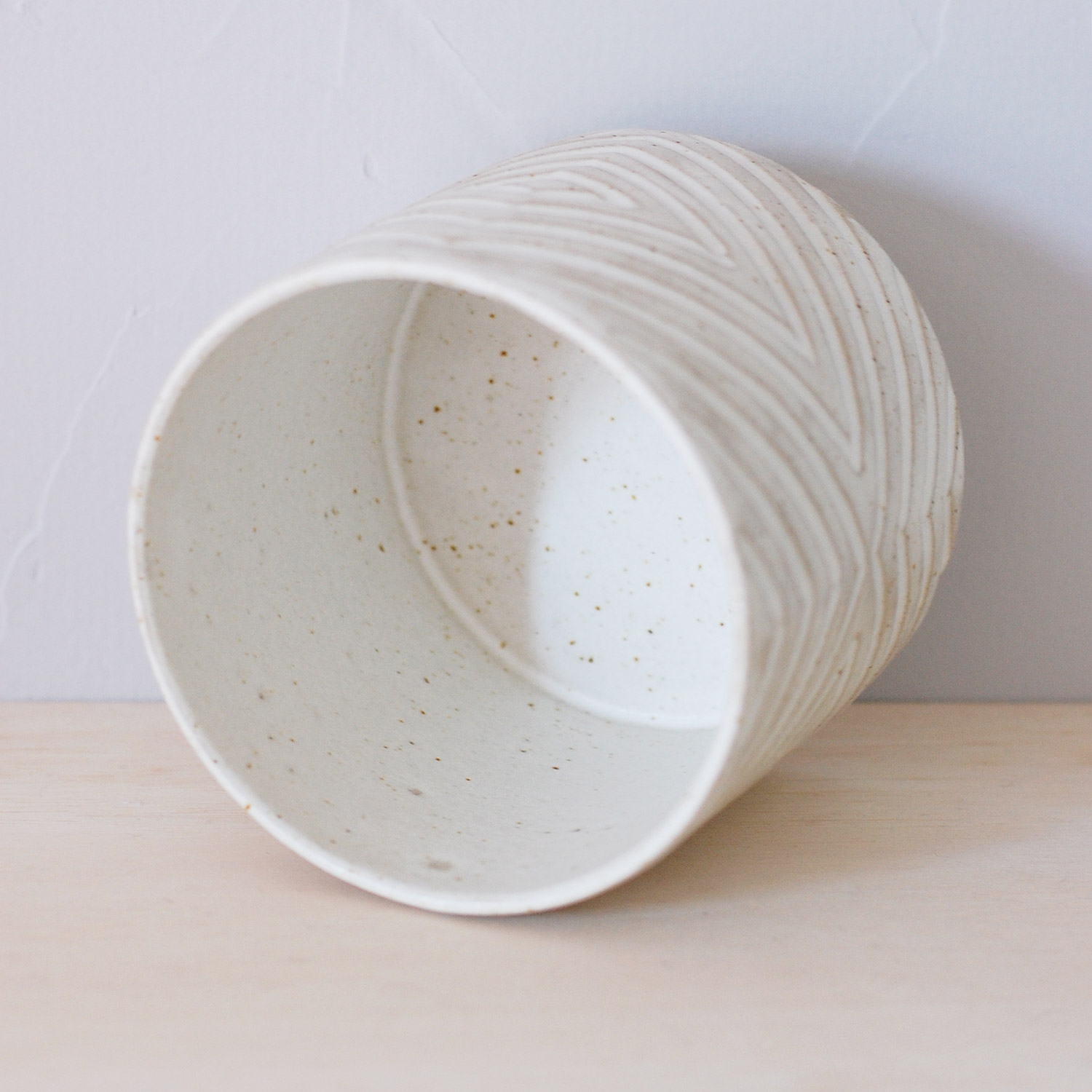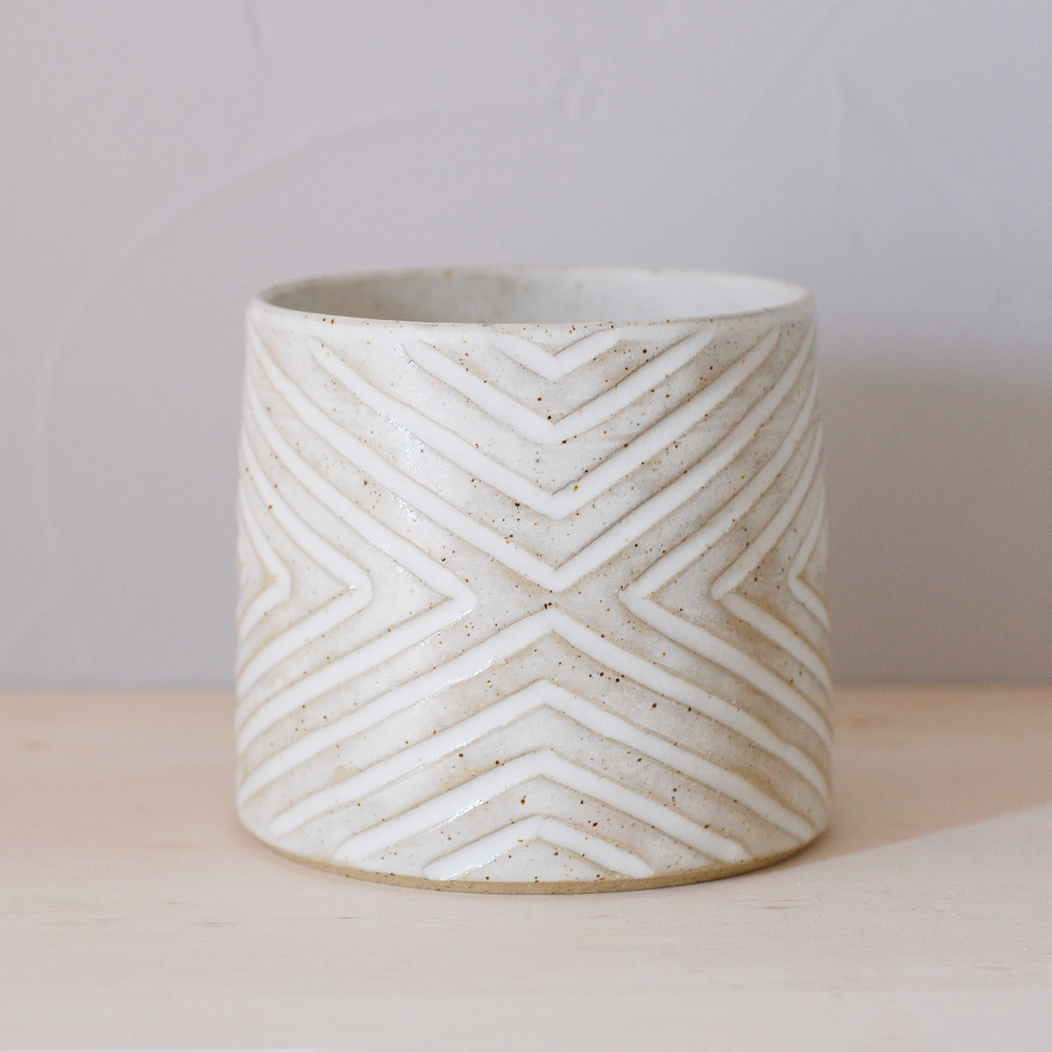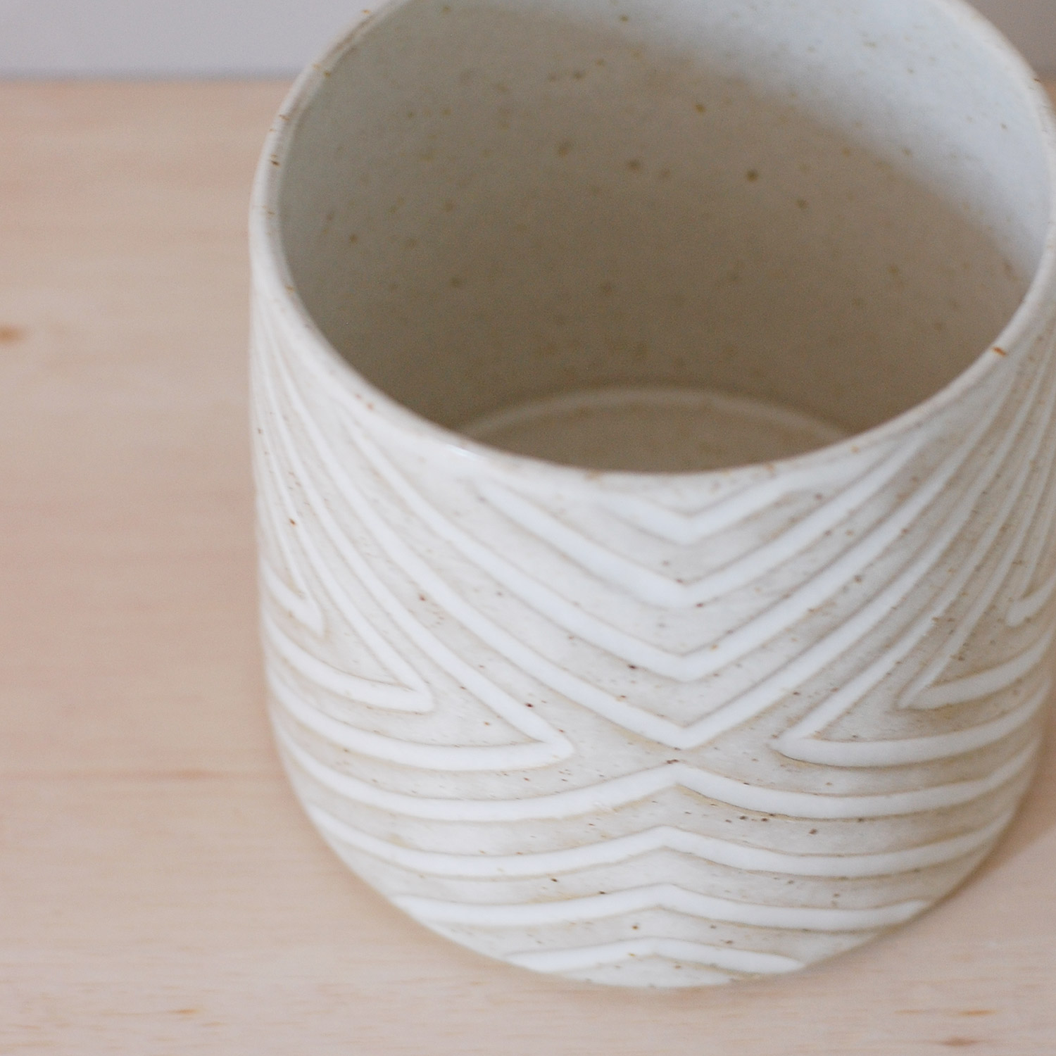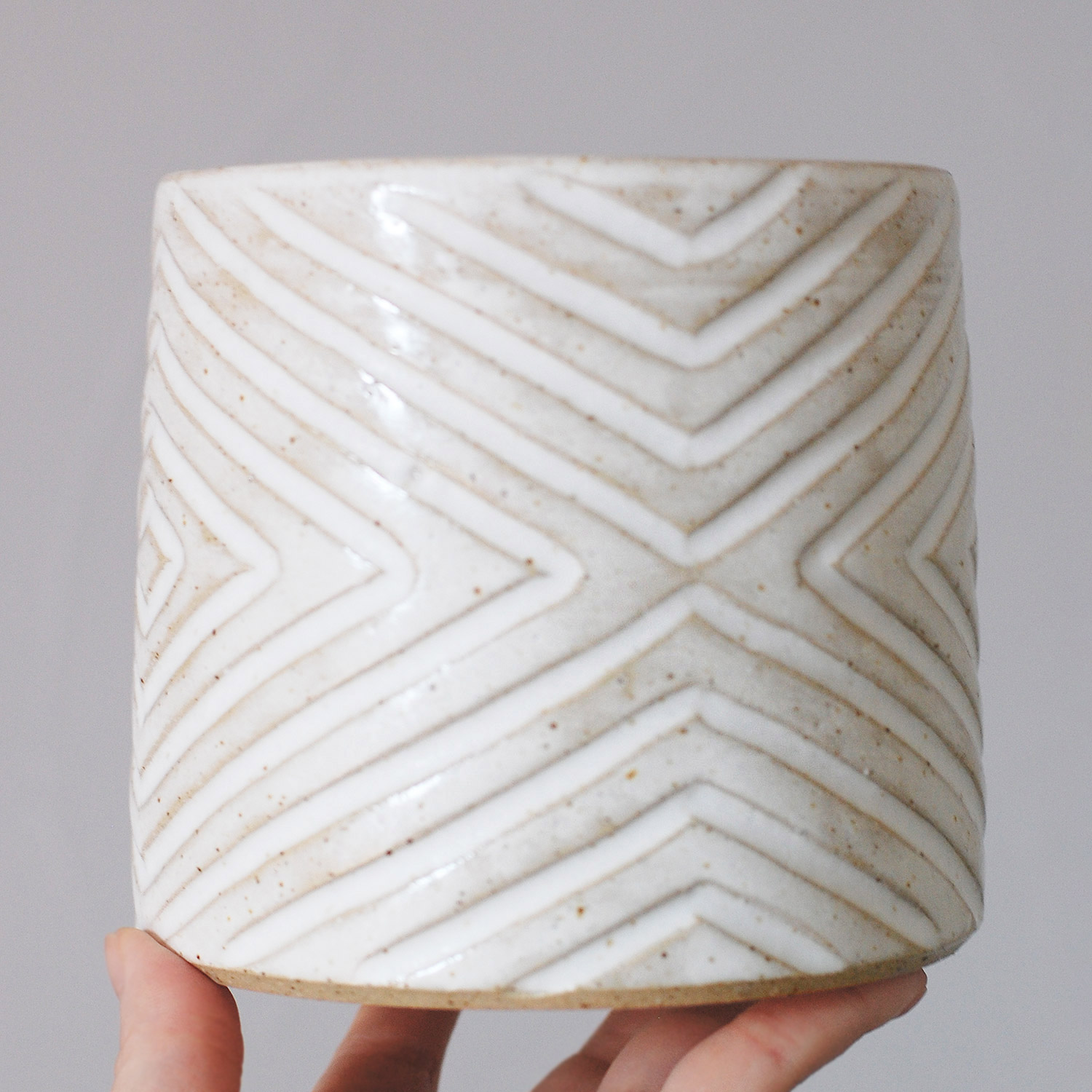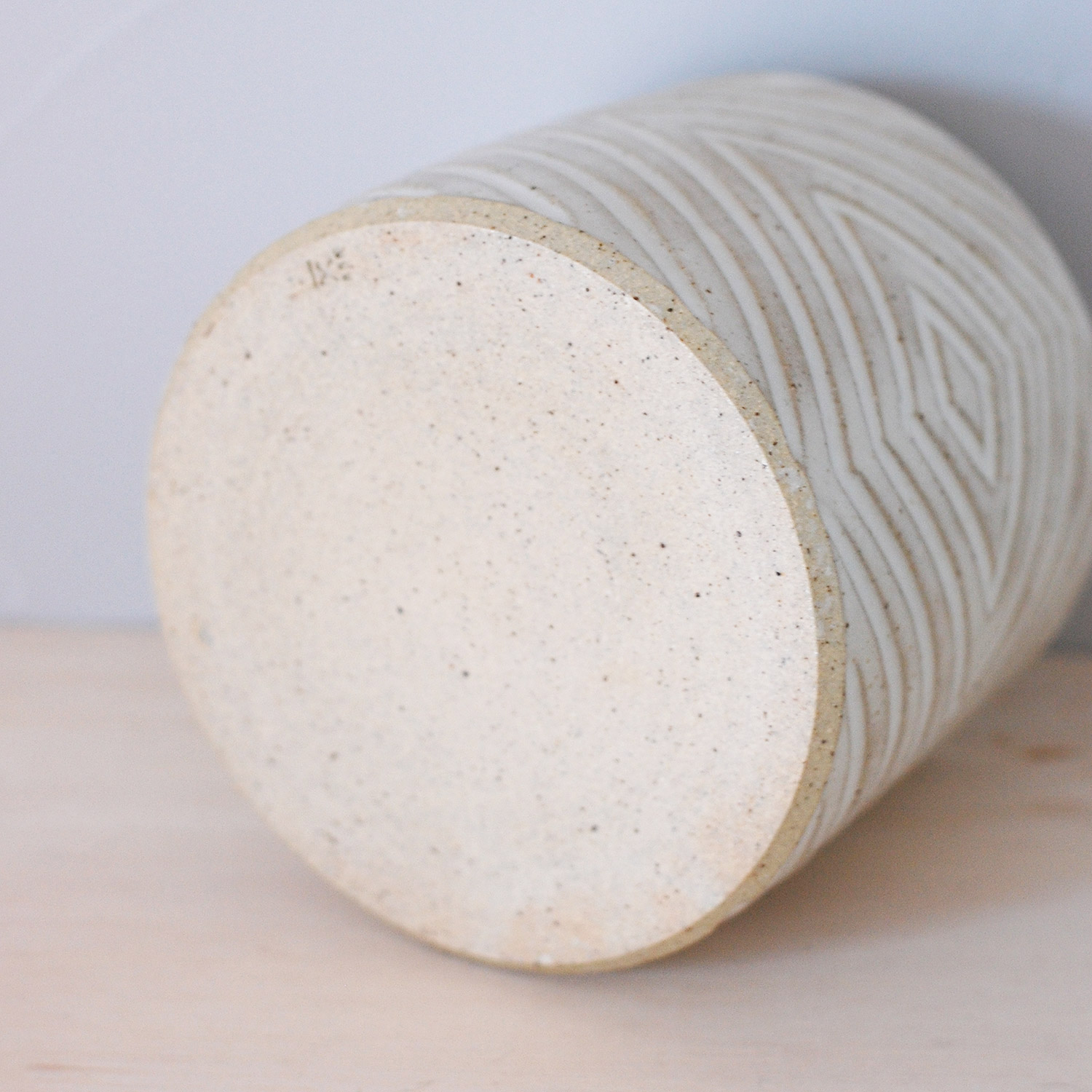 温かみのあるサンドベージュ色の陶土をろくろ成型し、手で模様を彫っています。